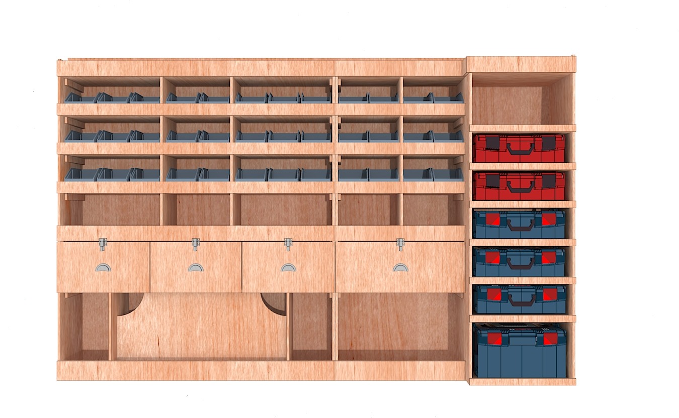 • Module pour Électroportatif : Un module vertical dédié au rangement de vos mallettes d’outils (type Festool Systainer, Makita, Facom etc.). Des rebords de maintien assurent une stabilité parfaite pendant le transport.