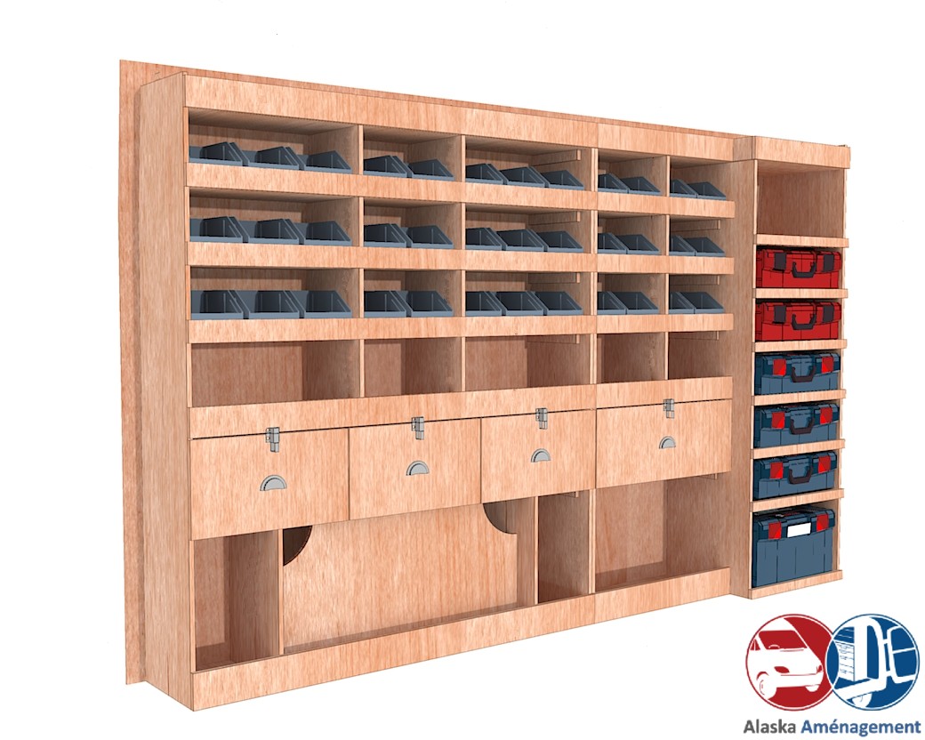 Ce meuble de rangement KRMG004-N(pour le latéral « Gauche » de votre véhicule) offre une solution polyvalente et fonctionnelle avec sept niveaux de stockage. Il comprend des étagères pour bacs à bec, une rangée de tiroirs et un module spécifique pour les mallettes d’électroportatif. Une étagère supérieure est conçue pour les objets longs. Son fond arrière intégré assure la rigidité et protège la carrosserie du véhicule, évitant un habillage supplémentaire. Le meuble est disponible en contreplaqué brut ou filmé.