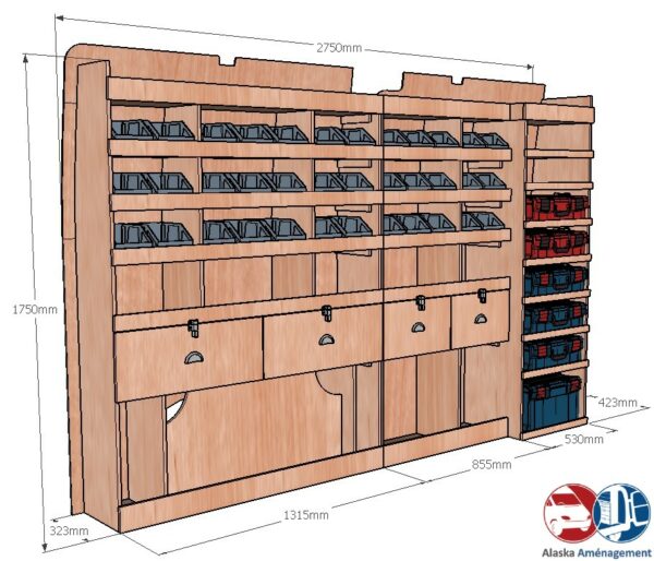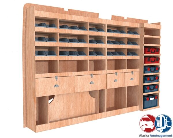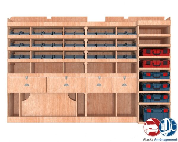 Ce meuble de rangement KRMG004-N(pour le latéral « Gauche » de votre véhicule) offre une solution polyvalente et fonctionnelle avec sept niveaux de stockage. Il comprend des étagères pour bacs à bec, une rangée de tiroirs et un module spécifique pour les mallettes d’électroportatif. Une étagère supérieure est conçue pour les objets longs. Son fond arrière intégré assure la rigidité et protège la carrosserie du véhicule, évitant un habillage supplémentaire. Le meuble est disponible en contreplaqué brut ou filmé.