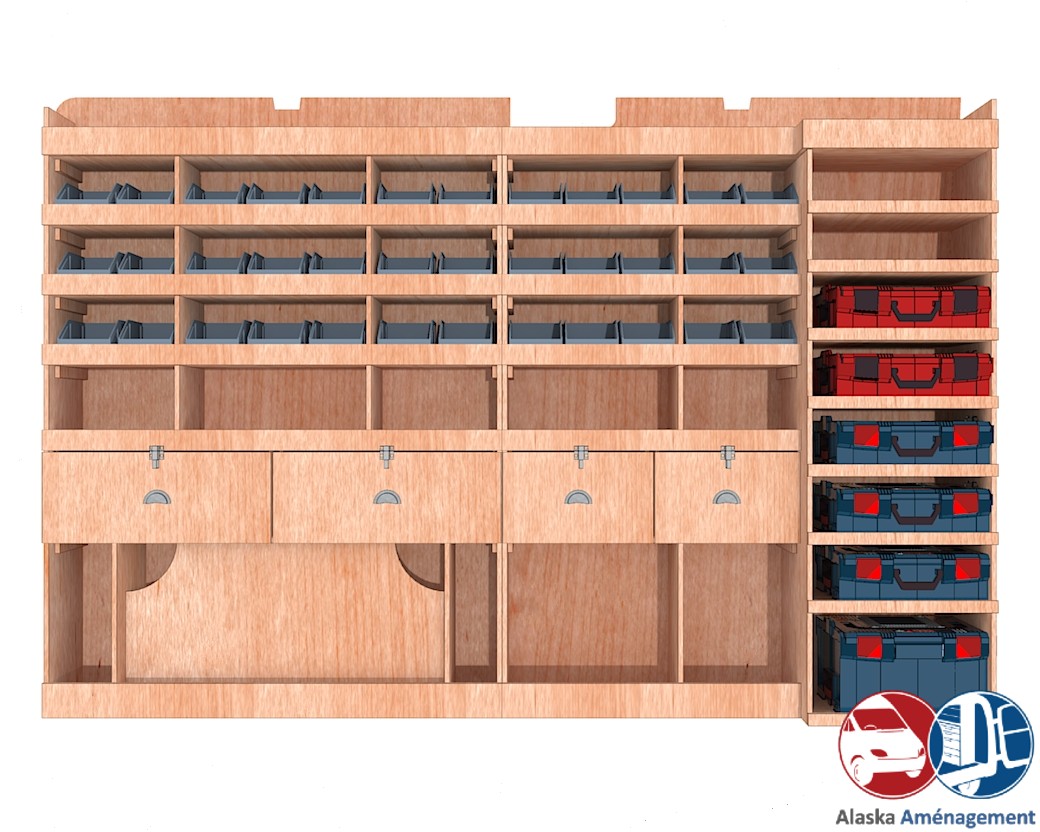 Ce meuble de rangement KRMG004-N (pour le latéral « Gauche » de votre véhicule) offre une solution polyvalente et fonctionnelle avec sept niveaux de stockage. Il comprend des étagères pour bacs à bec, une rangée de tiroirs et un module spécifique pour les mallettes d’électroportatif. Une étagère supérieure est conçue pour les objets longs. Son fond arrière intégré assure la rigidité et protège la carrosserie du véhicule, évitant un habillage supplémentaire. Le meuble est disponible en contreplaqué brut ou filmé. |