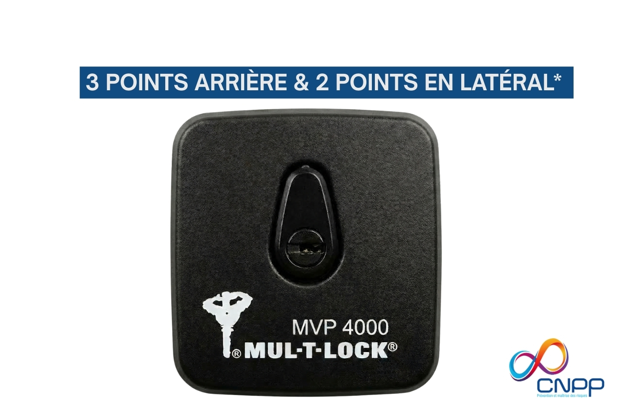 La serrure la plus sécurisée du marché: la MVP4000 de MUL-T-LOCK, 5 points de verrouillage!. Actuellement la serrure la plus sécurisée du marché, ce système premium offre une protection inégalée avec 3 points de verrouillage sur les portes arrière et 2 points sur la porte latérale*. Un véritable bouclier pour votre espace de chargement. (*À noter : la double sécurité 2 points n’est pas encore disponible pour tous les modèles de véhicule). 🔒 Agréée CNPP : La garantie d’une sécurité maximale Léger à l’usage mais extrêmement robuste, le système MVP4000 est certifié par le CNPP (Centre National de Prévention et de Protection), vous garantissant une très haute résistance face aux tentatives de crochetage et de perçage. 🛡️ Un système indépendant pour déjouer les méthodes de vol La serrure MVP4000 n’est volontairement pas couplée à la fermeture centralisée de votre véhicule. Ce choix technique est primordial : la technique de vol la plus courante consiste à briser la petite vitre côté chauffeur pour passer le bras et appuyer sur le bouton de déverrouillage central des portes. Avec notre système indépendant, même si un intrus accède à la cabine de conduite, votre cargaison reste totalement verrouillée et inaccessible. 🔑 Une gestion des clés haute sécurité Priorisez la sécurité de votre cargaison grâce au cylindre breveté Mul-T-Lock intégré. Nos cylindres brevetés offrent un contrôle optimal sur la duplication de clés pour votre plus grande sérénité. Le MVP™4000 est disponible sous plusieurs plateformes de cylindres différentes avec plusieurs options de déverrouillage :