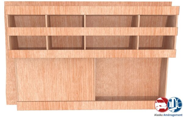 Ce pack comprend un meuble de rangement sur le côté gauche, un plancher de protection ainsi que des habillages pour les côtés et les portes. Il permet de mieux organiser votre matériel tout en gardant votre véhicule en bon état.
