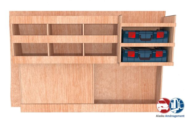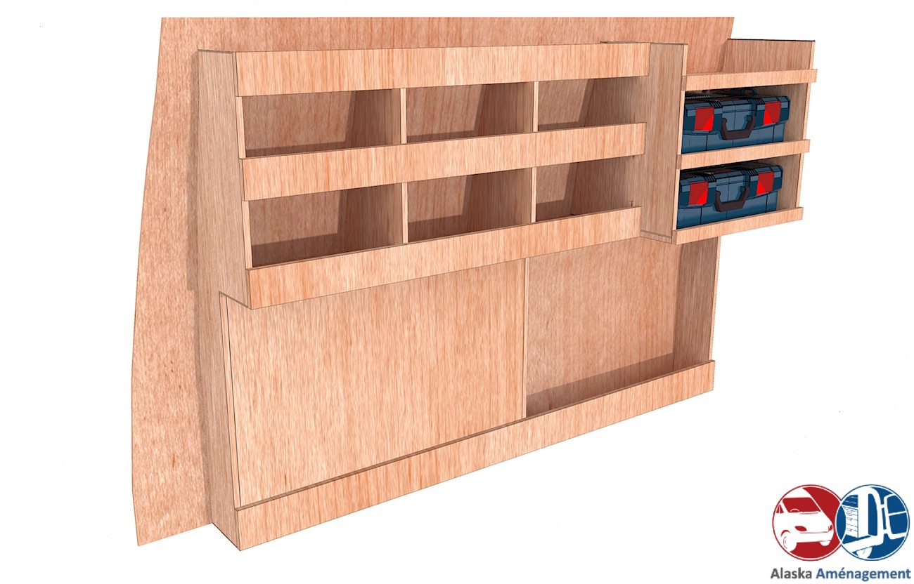 Ce pack comprend un meuble de rangement sur le côté gauche, un plancher de protection ainsi que des habillages pour les côtés et les portes. Il vous aide à mieux organiser votre matériel tout en préservant l’intérieur de votre véhicule.