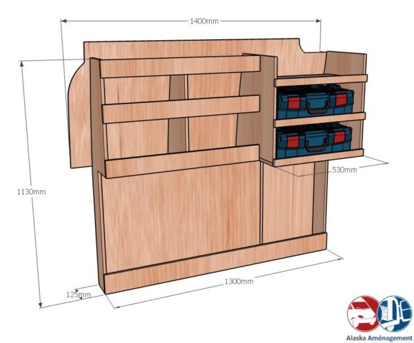 Ce pack comprend un meuble de rangement sur le côté gauche, un plancher de protection ainsi que des habillages pour les côtés et les portes. Il vous aide à mieux organiser votre matériel tout en préservant l’intérieur de votre véhicule.