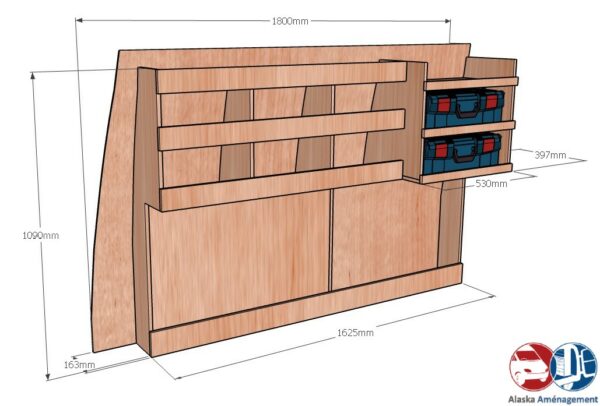 Le pack KRM2DC est une solution complète pour aménager votre véhicule. Il comprend deux meubles de rangement sur les côtés, un plancher de protection ainsi que des habillages pour les côtés et les portes. L’ensemble permet de garder votre matériel bien organisé tout en protégeant l’intérieur de votre véhicule au quotidien.