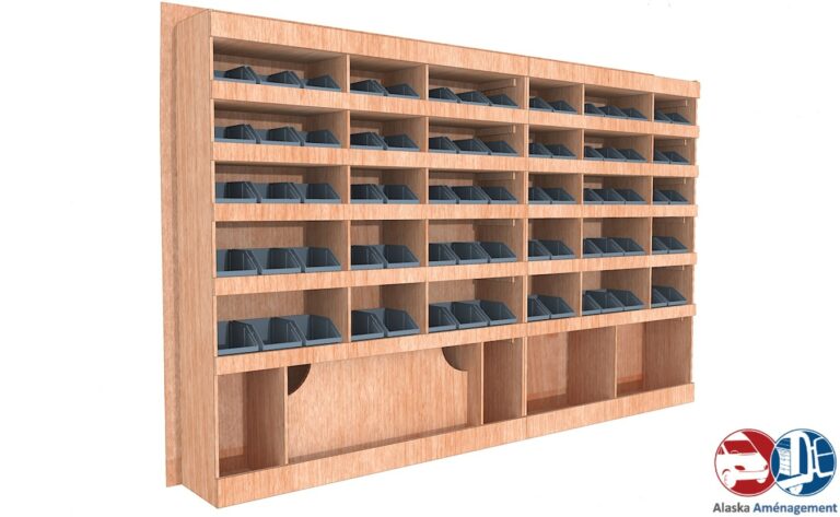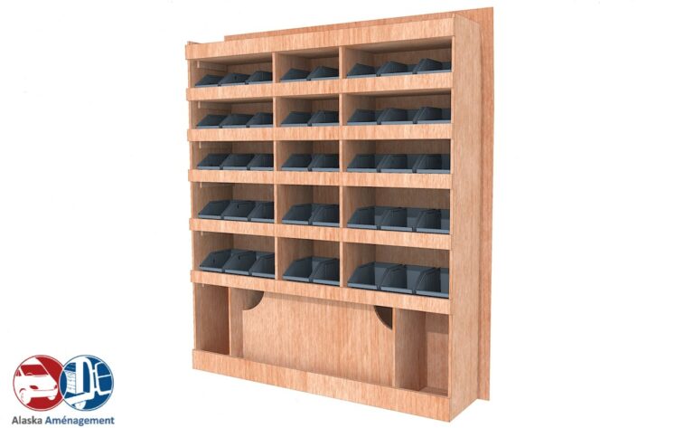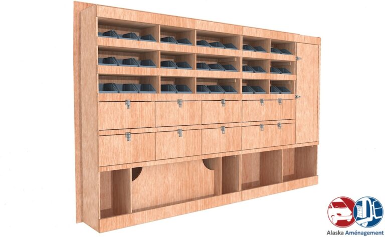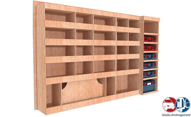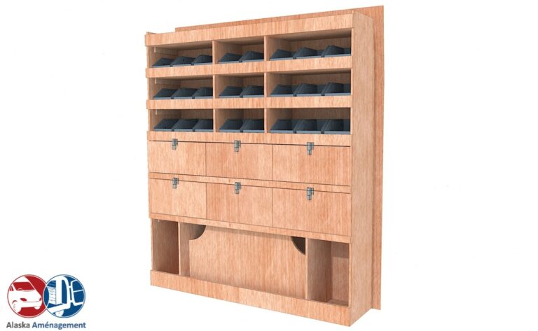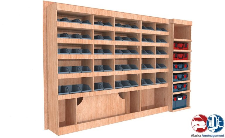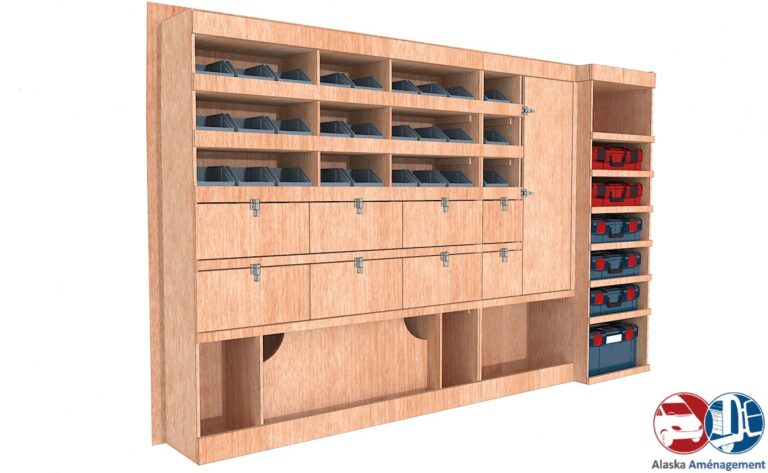 Rangement rapide avec bacs à bec et espace pour mallettes, pensé pour les artisans mobiles.…