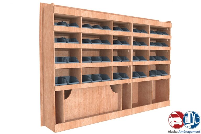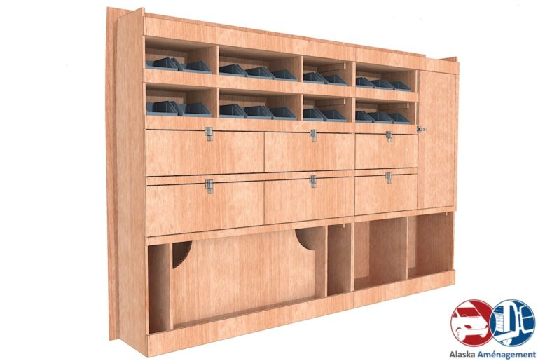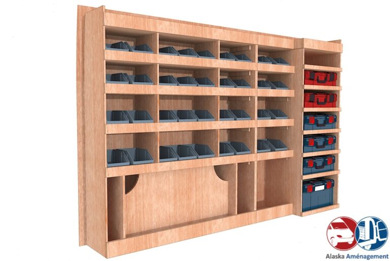 Rangement rapide avec bacs à bec et espace pour mallettes, pensé pour les artisans mobiles.…