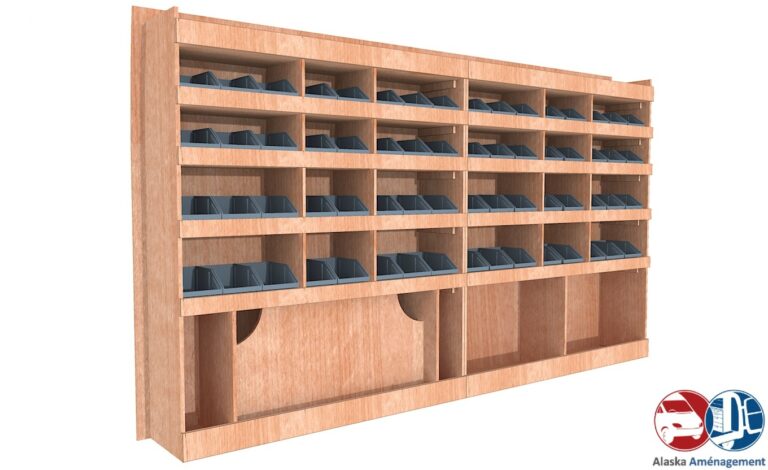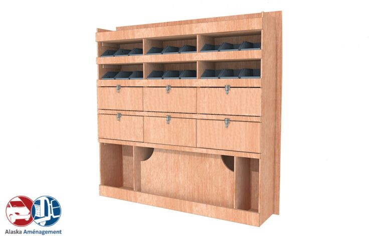 Rangement rapide avec bacs à bec et espace pour mallettes, pensé pour les artisans mobiles.…