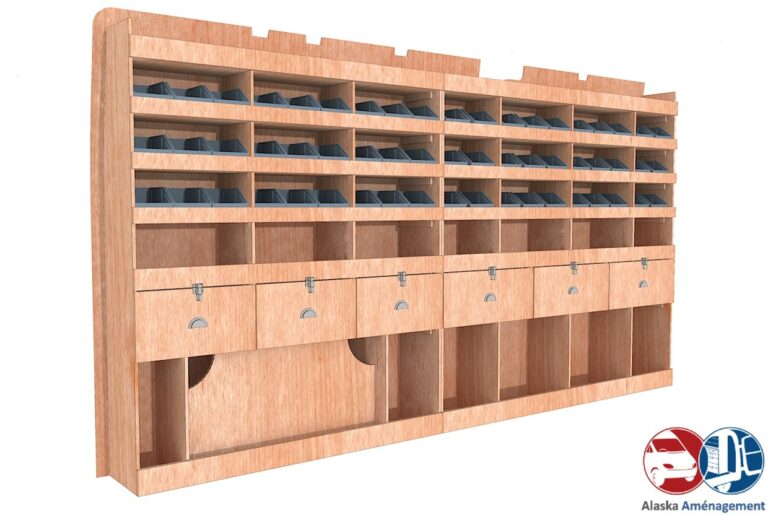 Rangement rapide avec bacs à bec et espace pour mallettes, pensé pour les artisans mobiles.…