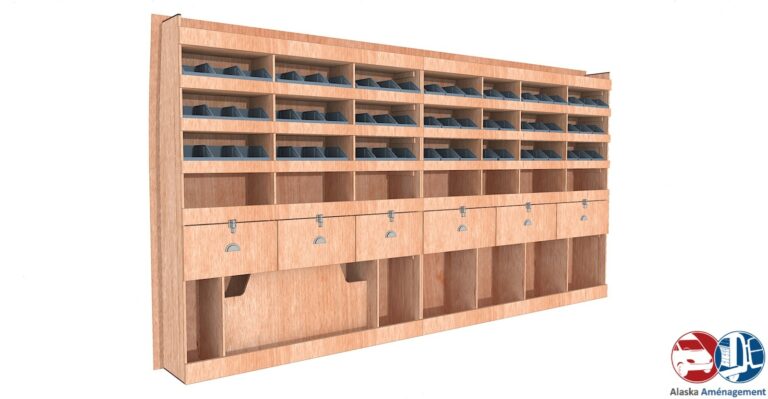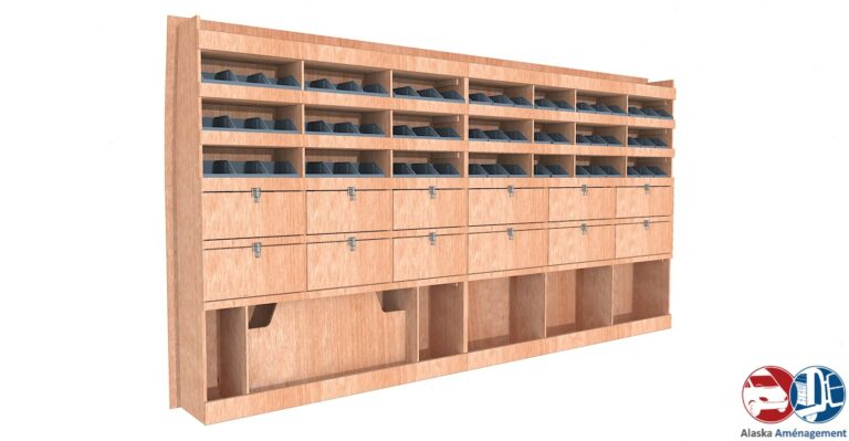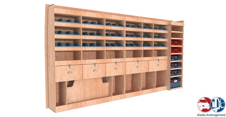 Rangement rapide avec bacs à bec et espace pour mallettes, pensé pour les artisans mobiles.…