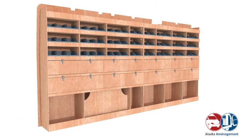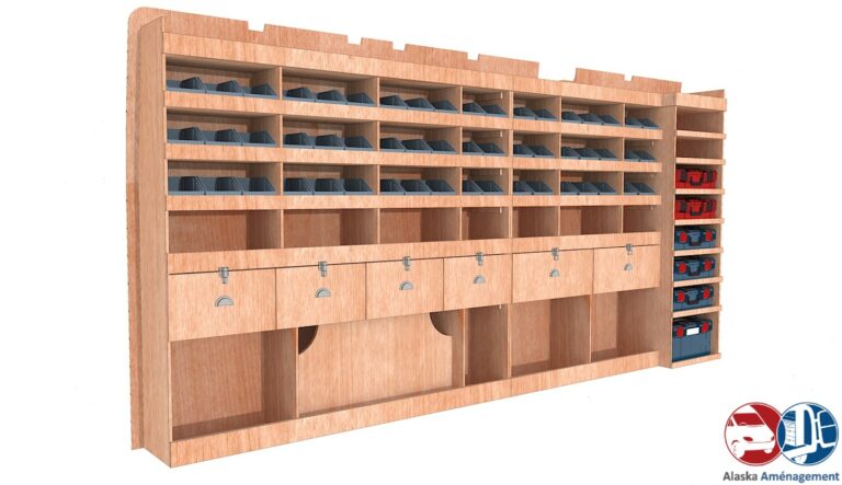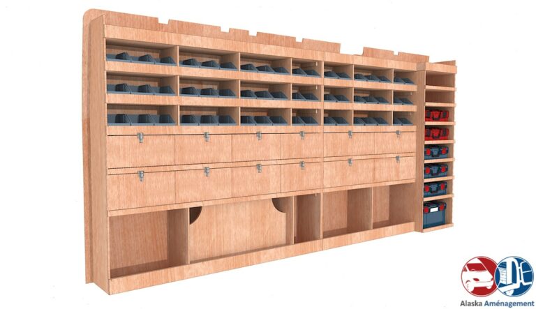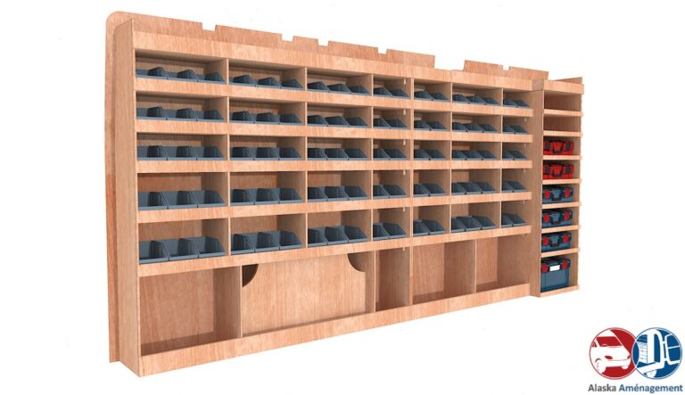 Rangement rapide avec bacs à bec et espace pour mallettes, pensé pour les artisans mobiles.…