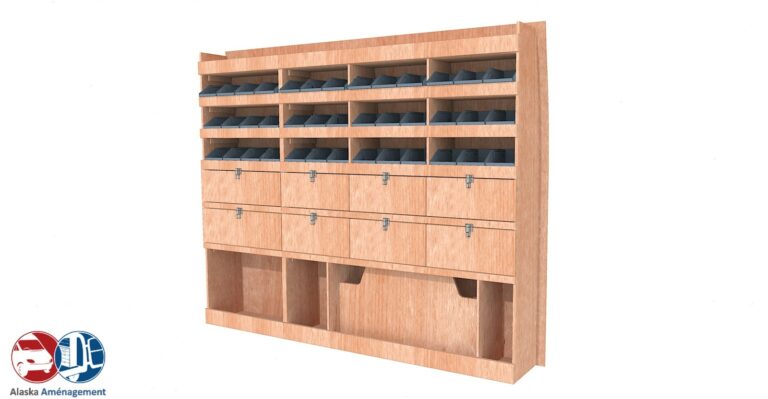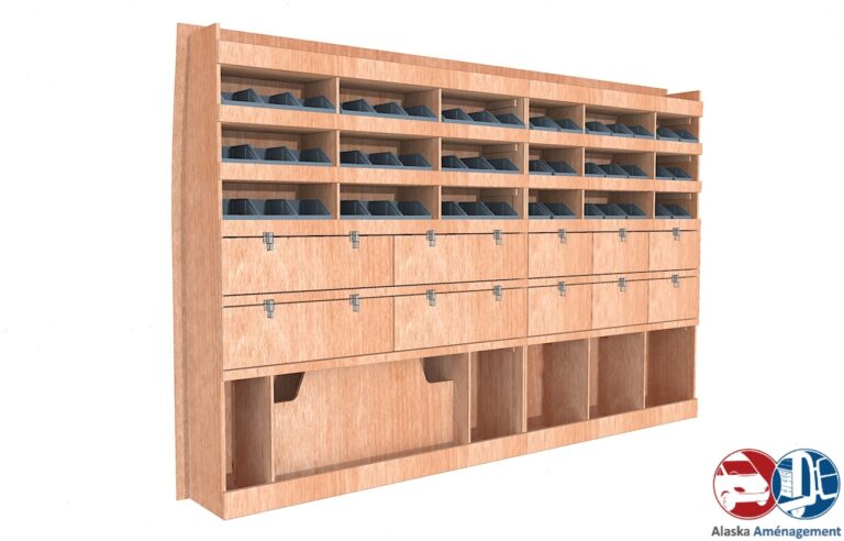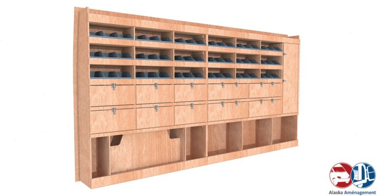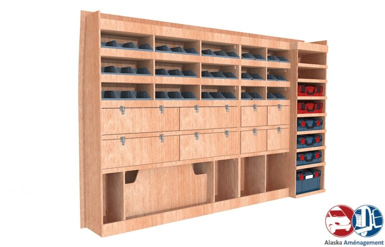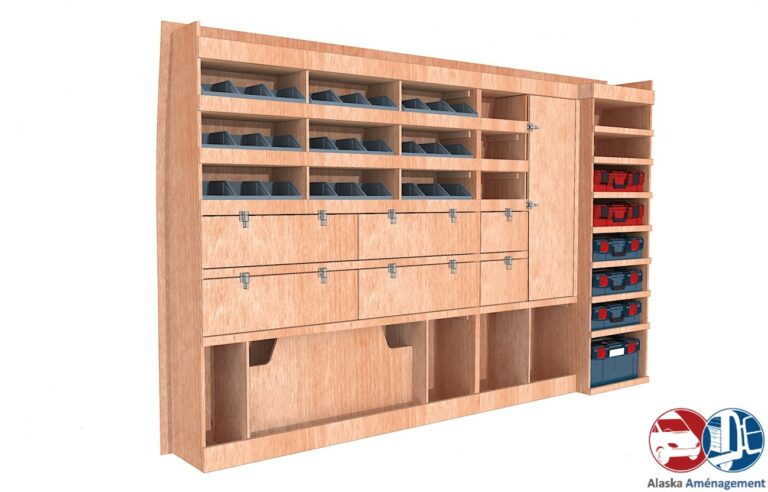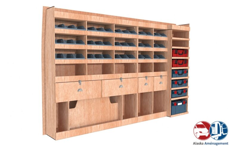 Rangement rapide avec bacs à bec et espace pour mallettes, pensé pour les artisans mobiles.…