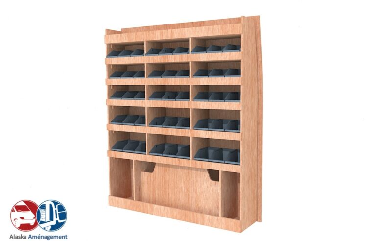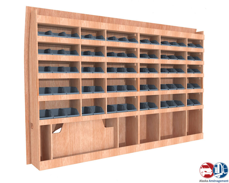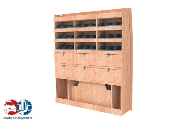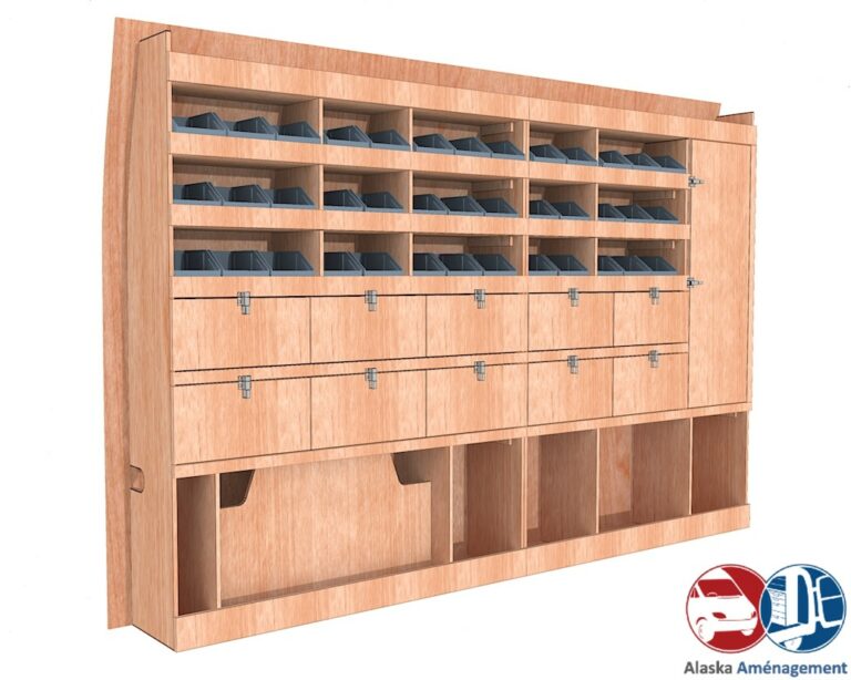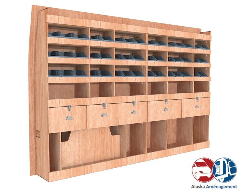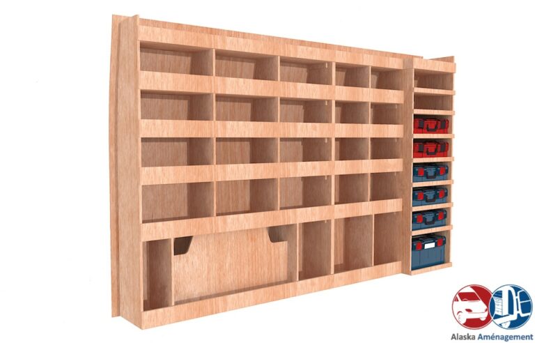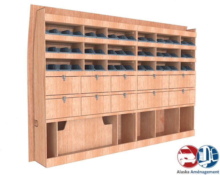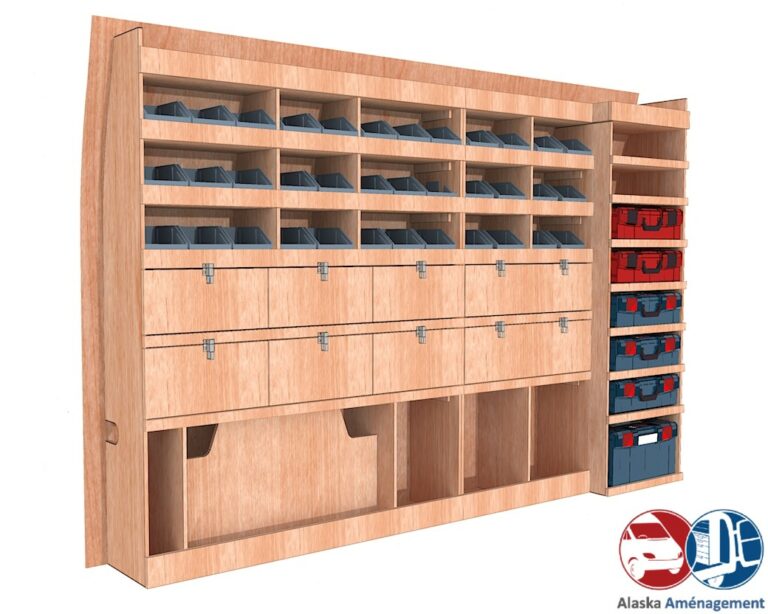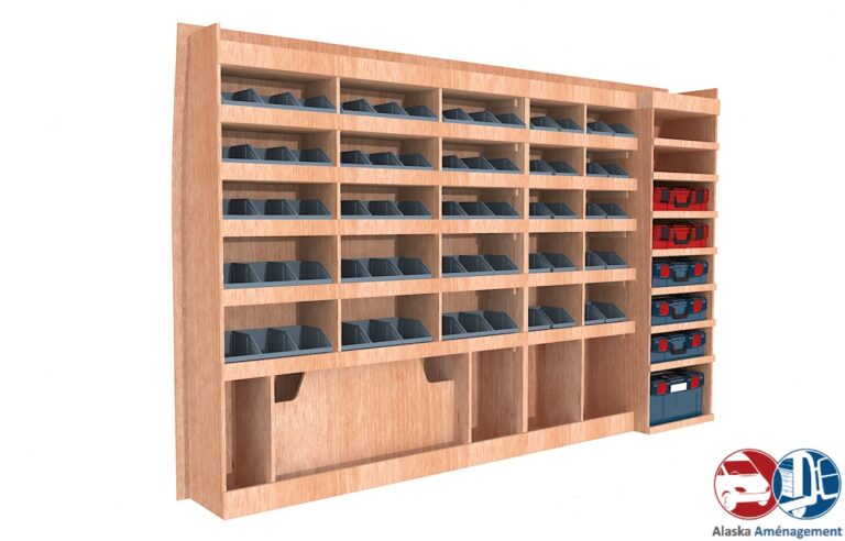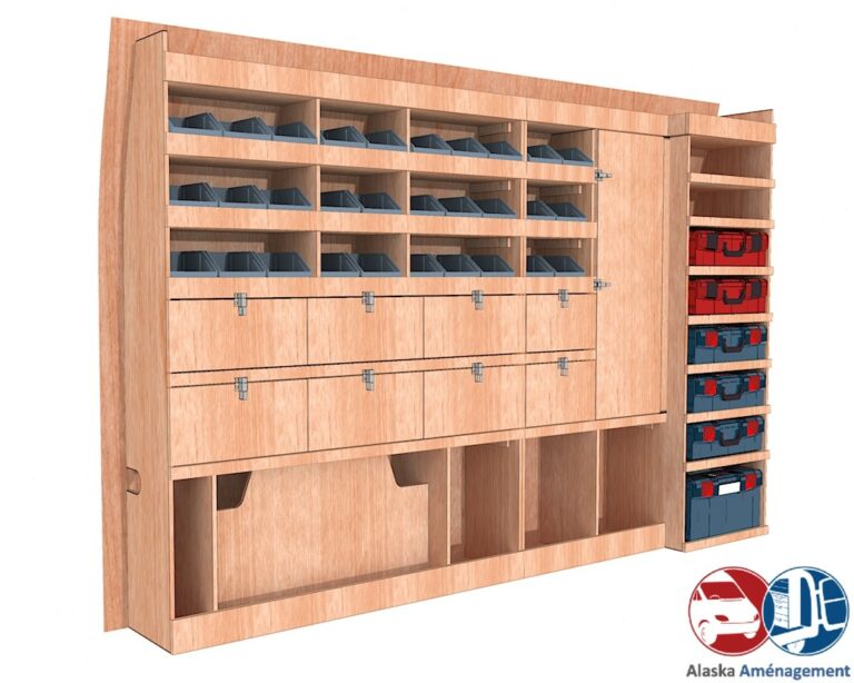 Rangement rapide avec bacs à bec et espace pour mallettes, pensé pour les artisans mobiles.…